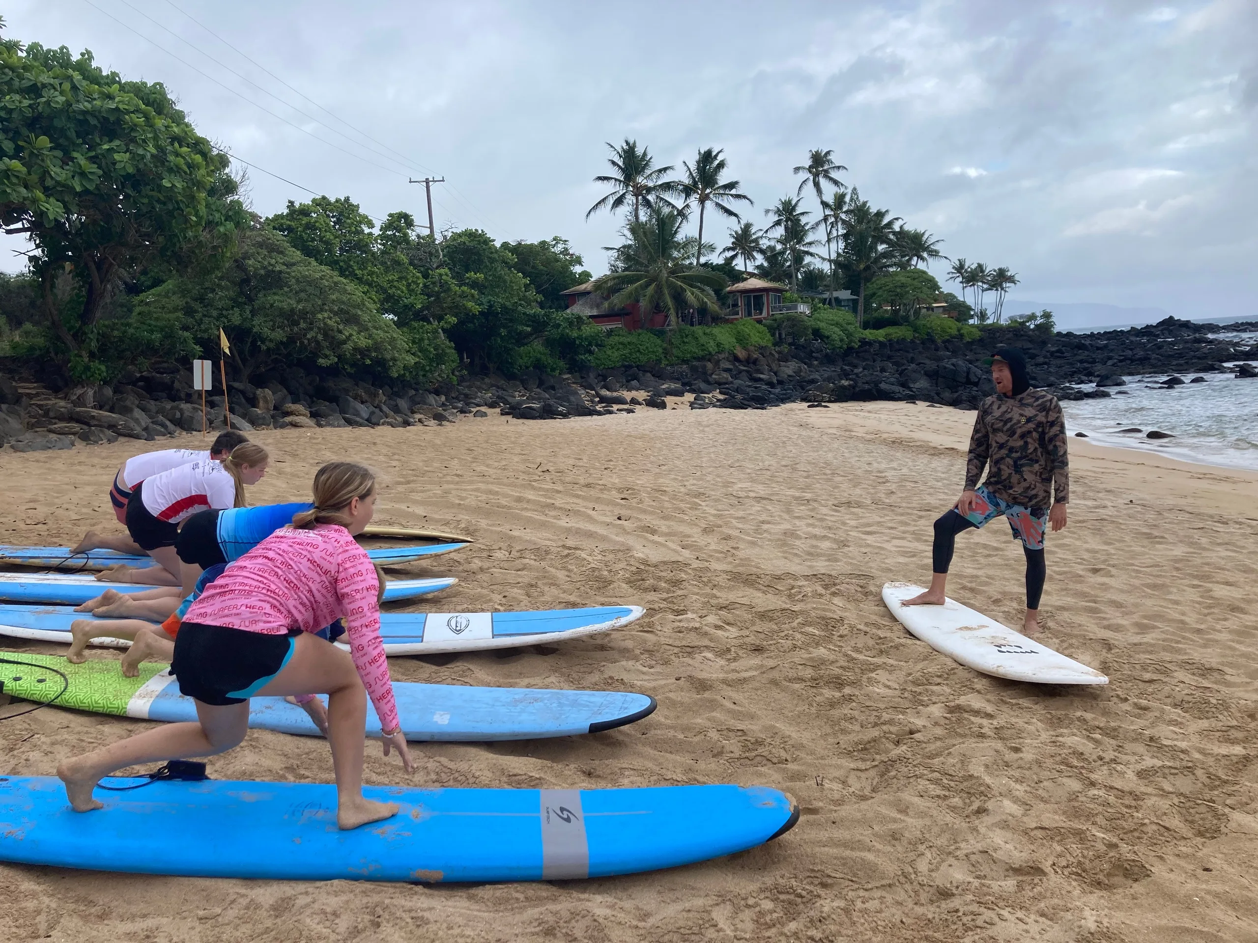 The exact lesson location is confirmed via text the day before, considering surf conditions. Larger groups or private lessons can be arranged by calling (808) 430-8668.