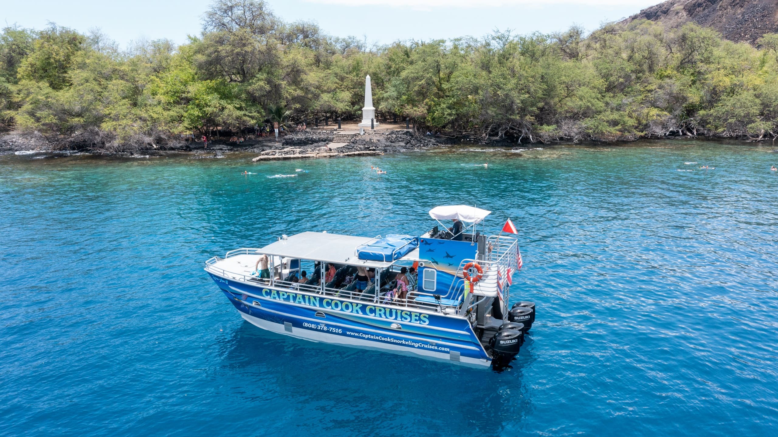 Departing from Honokohau Harbor at 12pm, this cruise takes you on a scenic route along the coast, offering views of the stunning shoreline and dramatic cliffs that line the Big Island. Once you reach the famous Captain Cook Monument, located on the edge of Kealakekua Bay, you’ll have the opportunity to snorkel in one of the most pristine marine environments in the world. Kealakekua Bay is renowned for its calm, clear waters, and vibrant coral reefs, making it a top snorkeling destination for both beginners and experienced snorkelers.