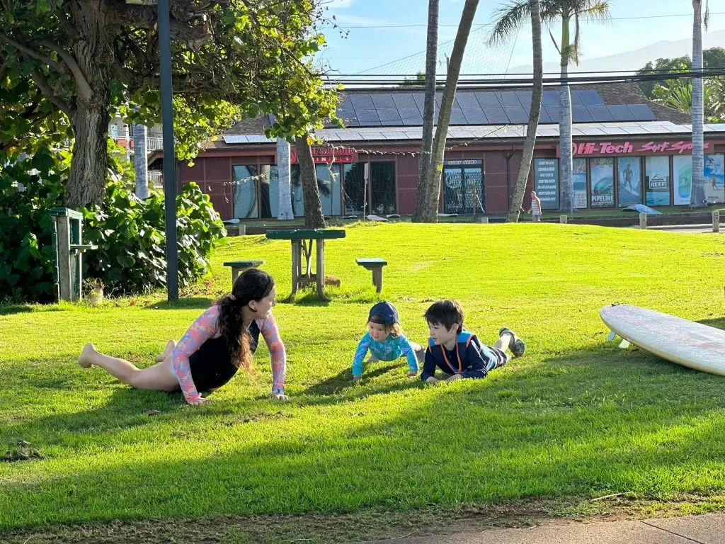 When conditions allow, kids practice paddling, safe falling, and popping up in the water. Locations include Westside-Kapalua Bay near the rental place and Southside-The Cove Beach Park under the shade tree.