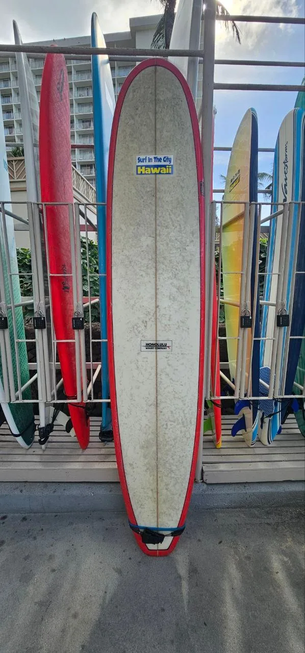 Surf Waikiki Beach with the Locker (#6) 9ft fiberglass surfboard rental from Honolulu Surf Co. This fiberglass board allows access to multiple surf breaks and convenient locker rental access.