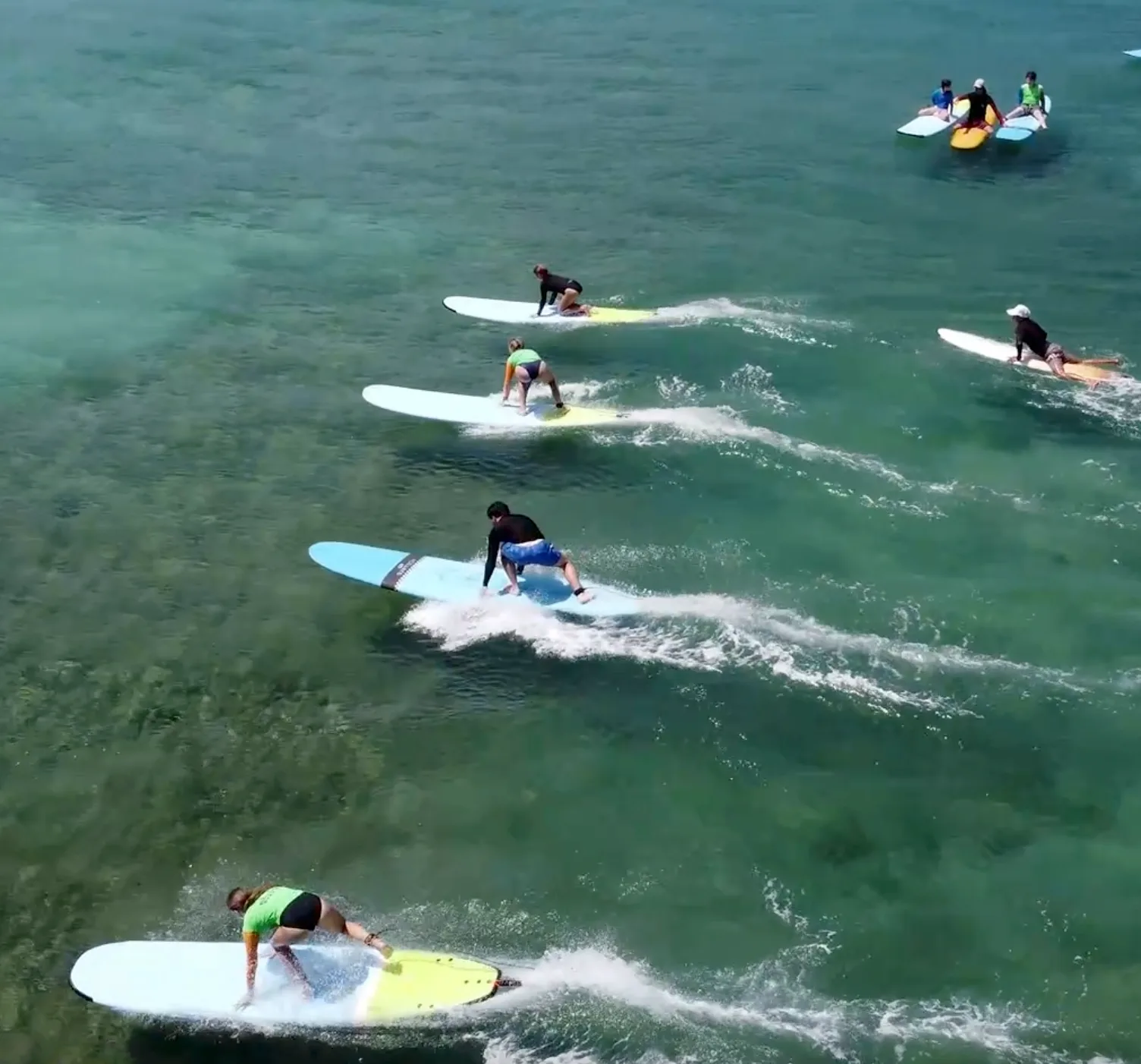 Students receive rotating one-on-one feedback to ensure individual progress. This lesson format is ideal for school groups, corporate outings, celebrations, or retreats seeking a lively shared surfing experience.