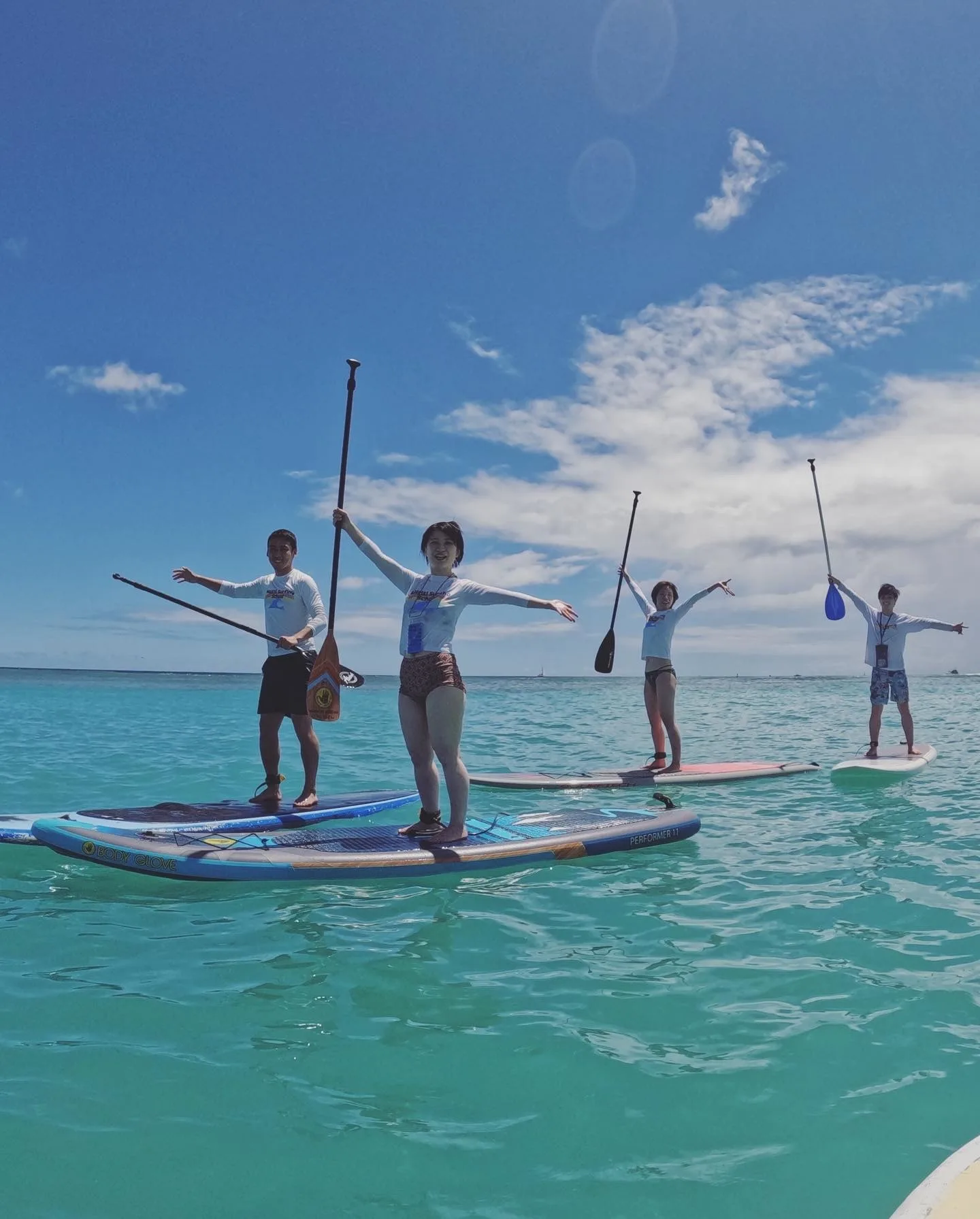 Join Waikiki Surfing School for a SUP group lesson with a maximum of 4 students per instructor. Reef shoes and rash guards are provided; if you bring your own rash guard, a long sleeve is recommended. A free logo hat is included as a thank you gift.
