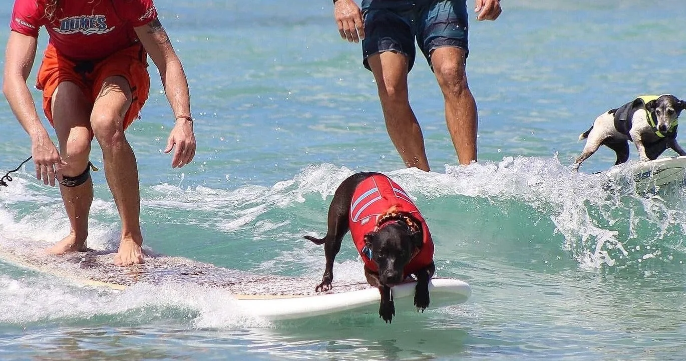 Surfing Lessons on North Shore, Oahu teach both dogs and humans how to ride waves. Max group size is 4 persons; bring swim suit, towel, hydration, and sunscreen.